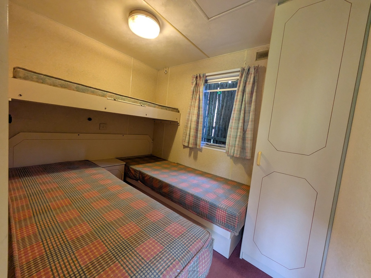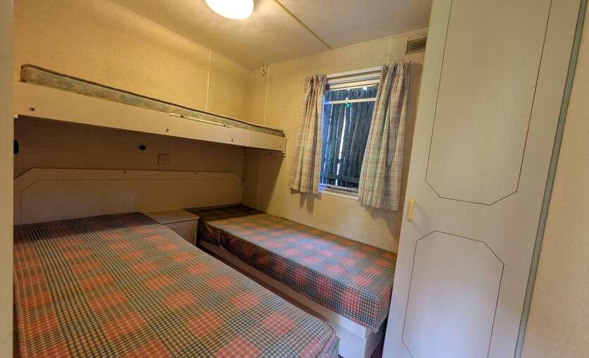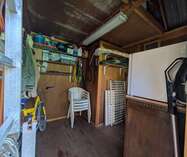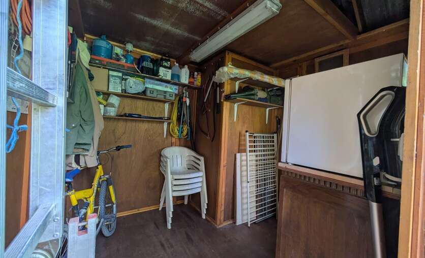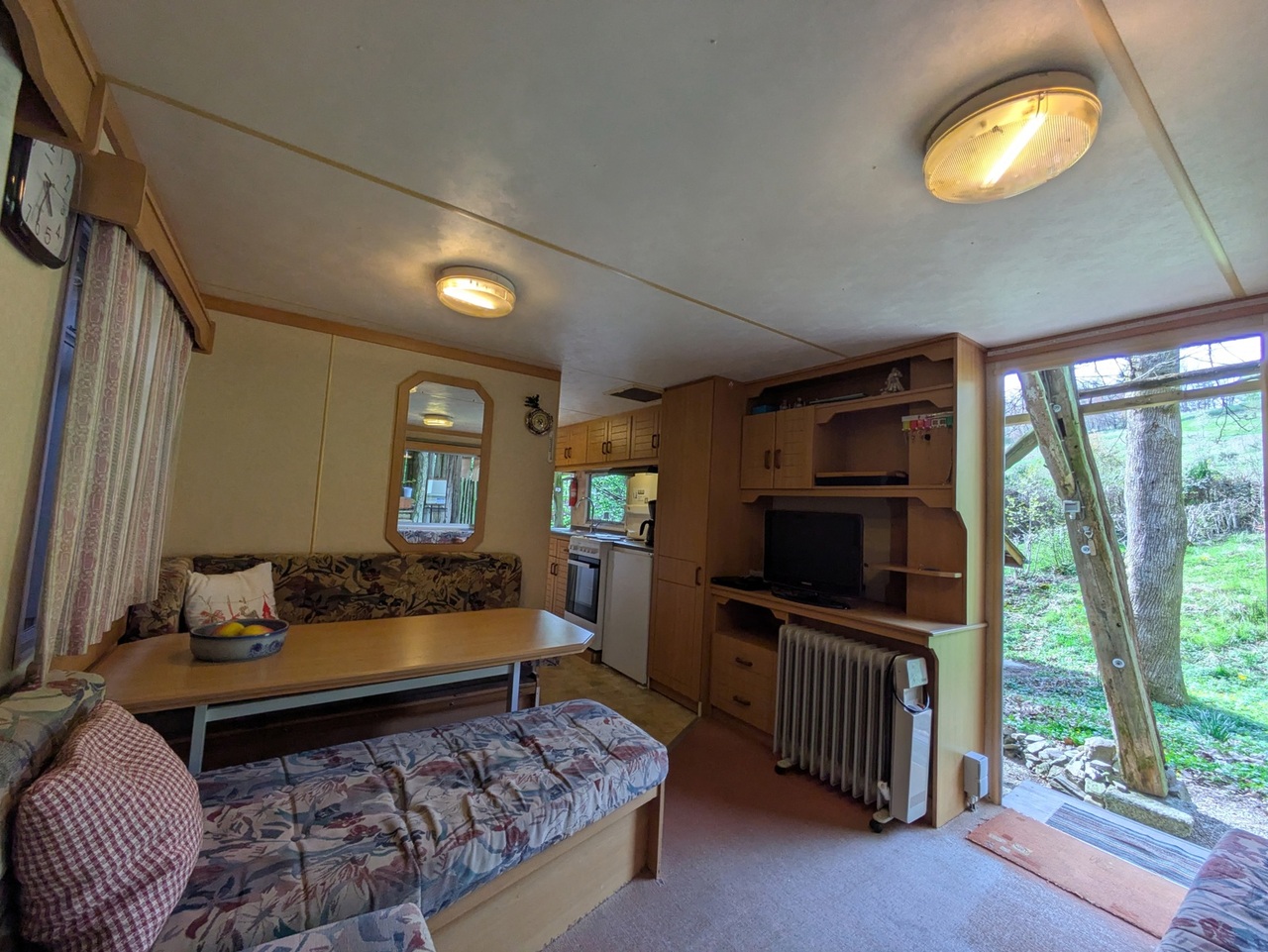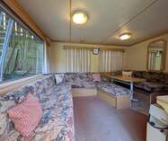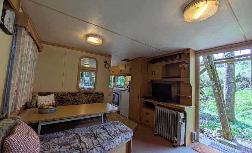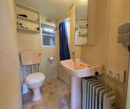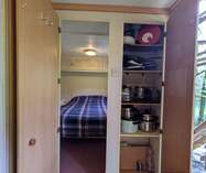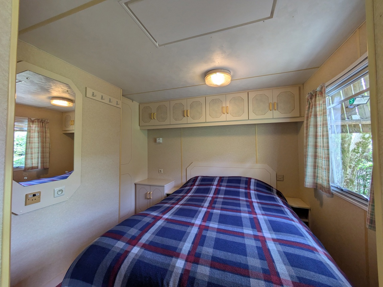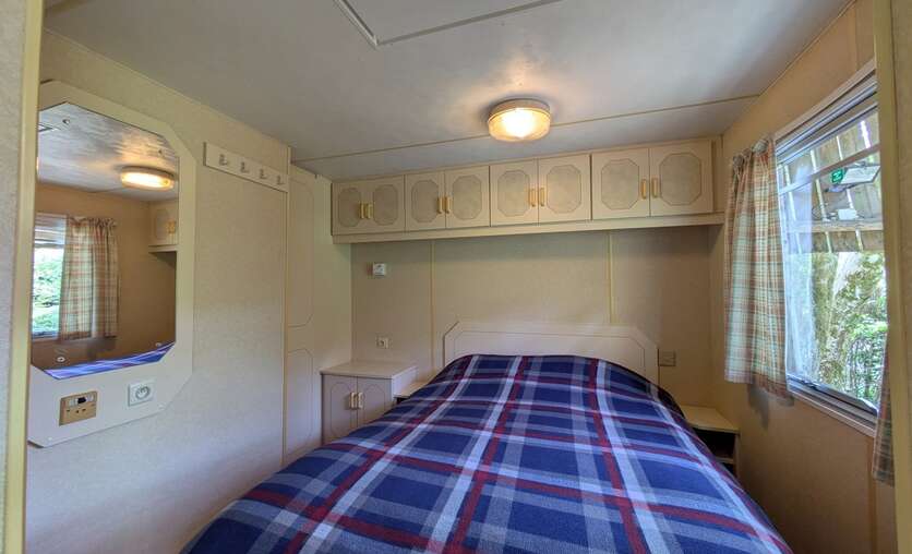 In de loods staat een goed beschutte stacaravan opgesteld, die momenteel wordt gebruikt als vakantiewoning. De caravan biedt plaats aan 5 personen en is voorzien van stadswater en een aansluiting op het elektriciteitsnet, met een conform gekeurde elektrische installatie. Verwarming, koken en warm water gebeuren volledig elektrisch.