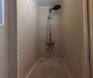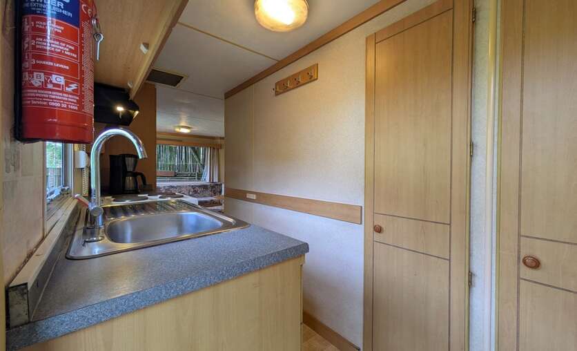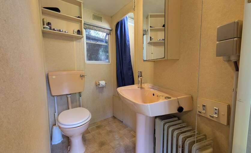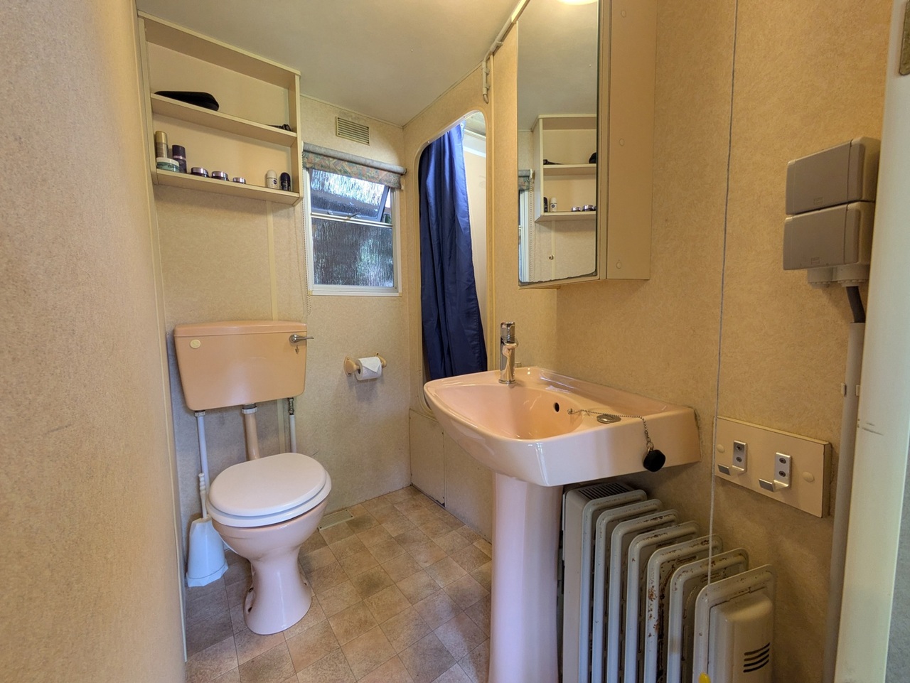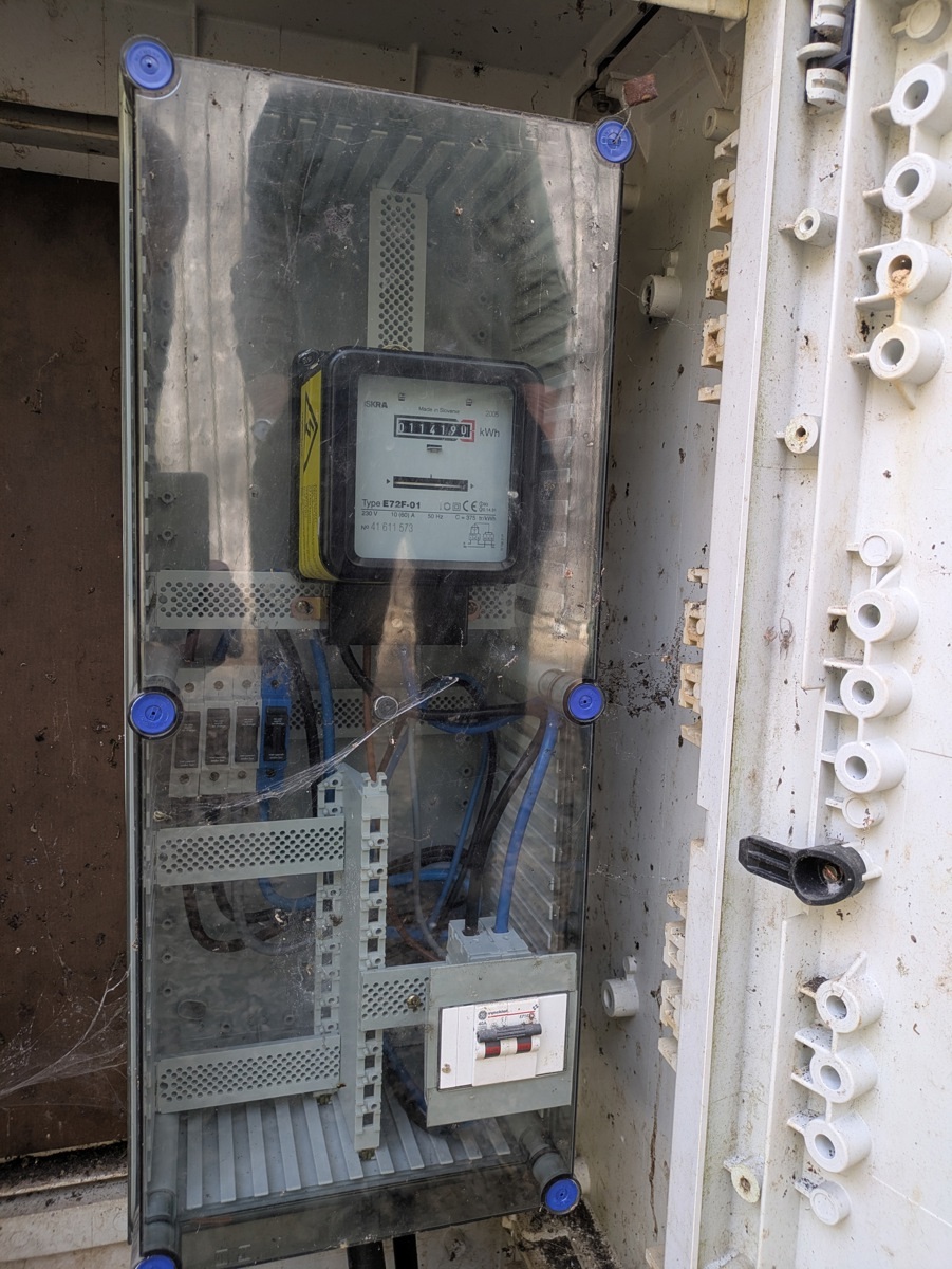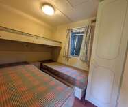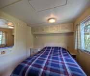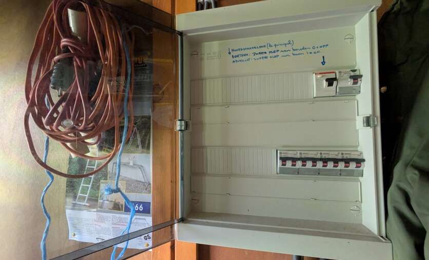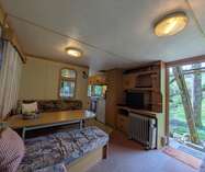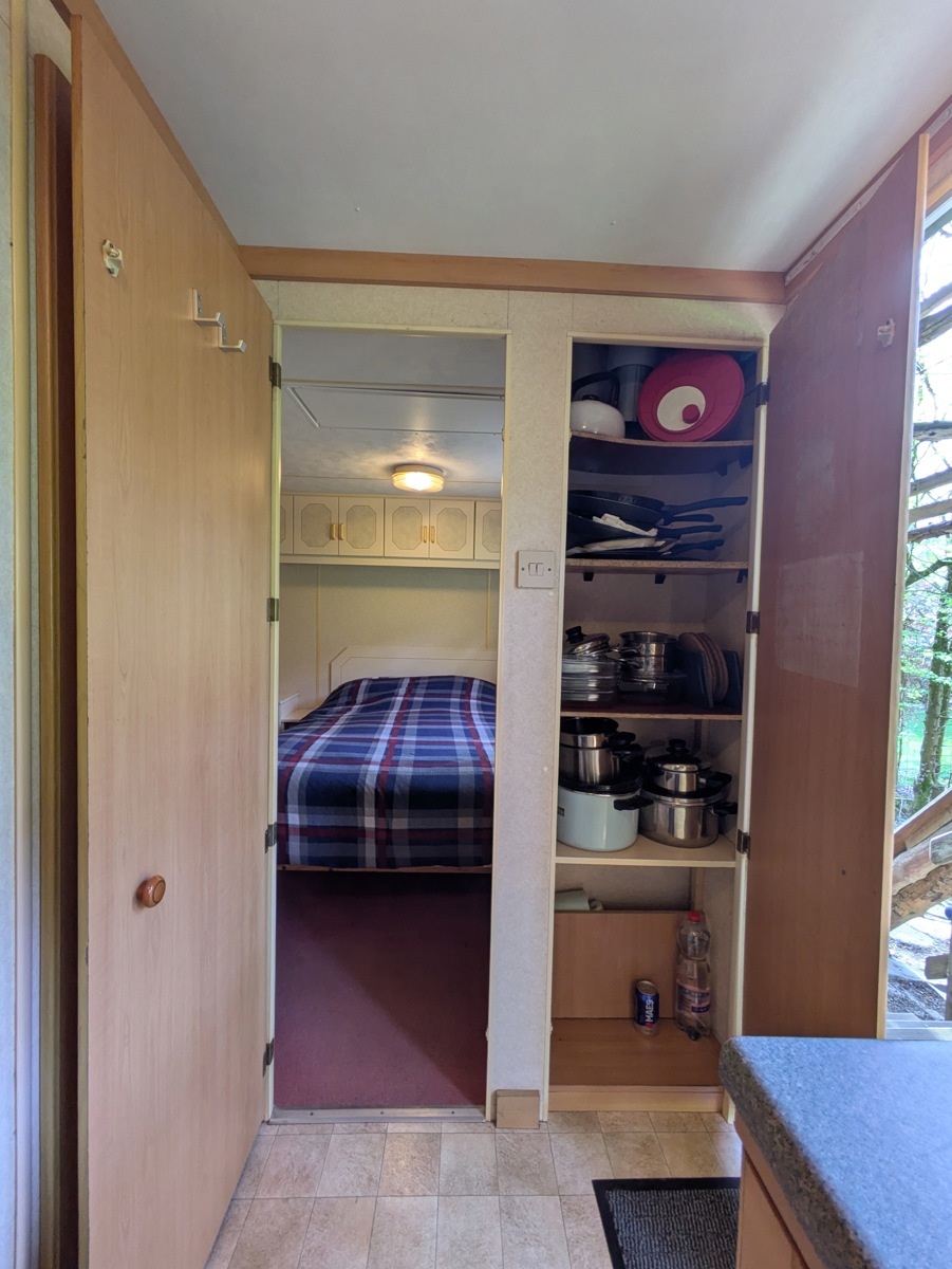 In de loods staat een goed beschutte stacaravan opgesteld, die momenteel wordt gebruikt als vakantiewoning. De caravan biedt plaats aan 5 personen en is voorzien van stadswater en een aansluiting op het elektriciteitsnet, met een conform gekeurde elektrische installatie. Verwarming, koken en warm water gebeuren volledig elektrisch.