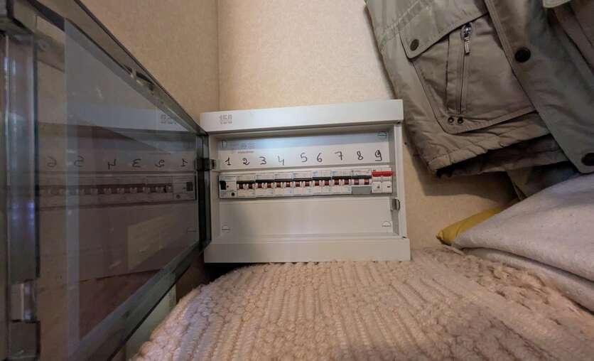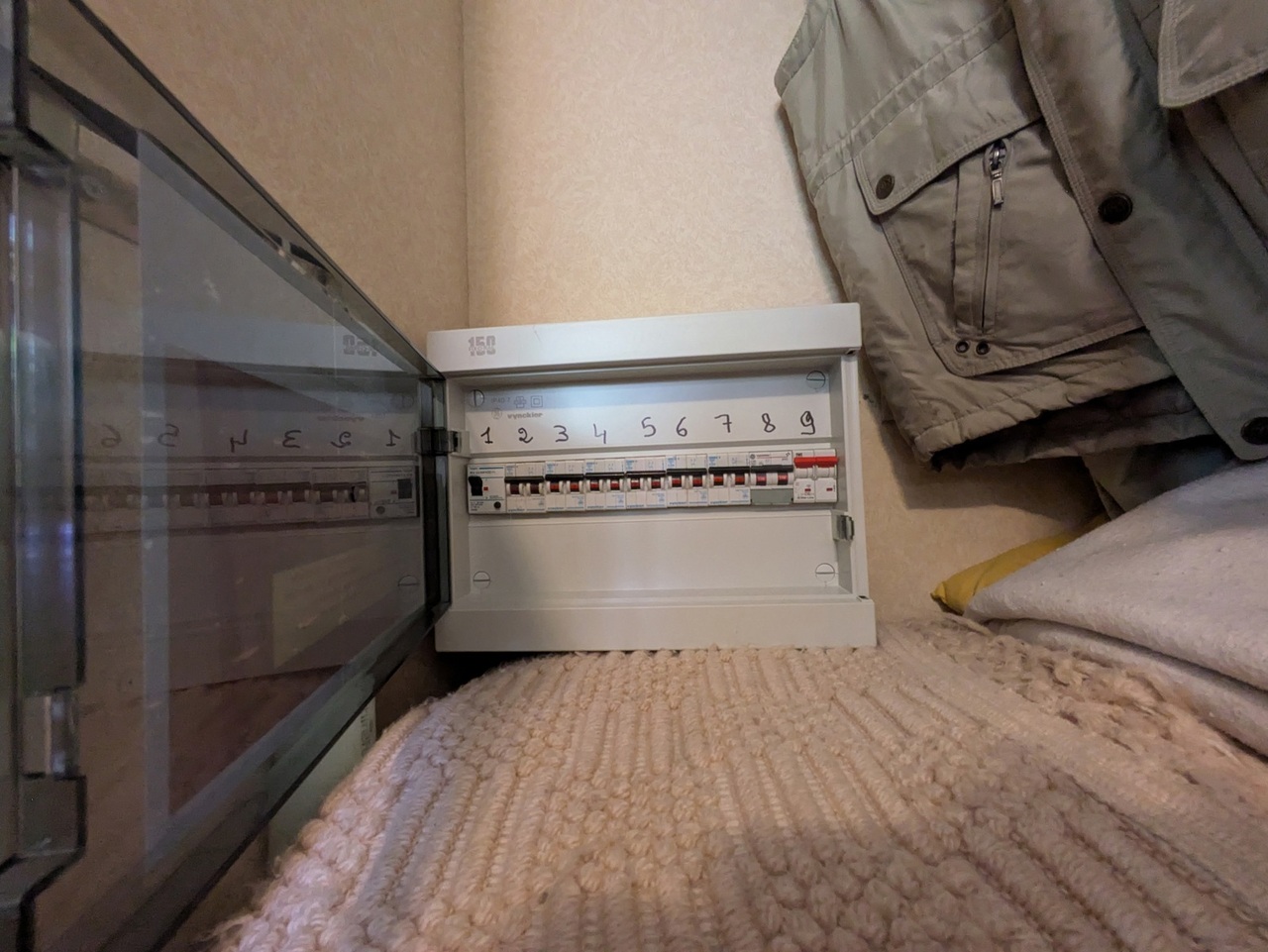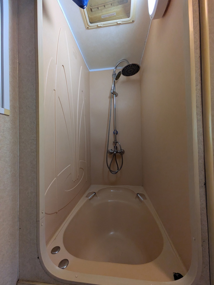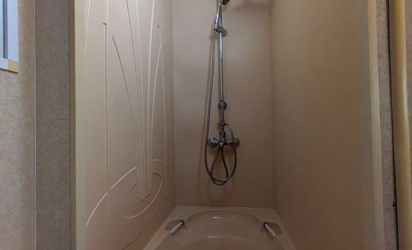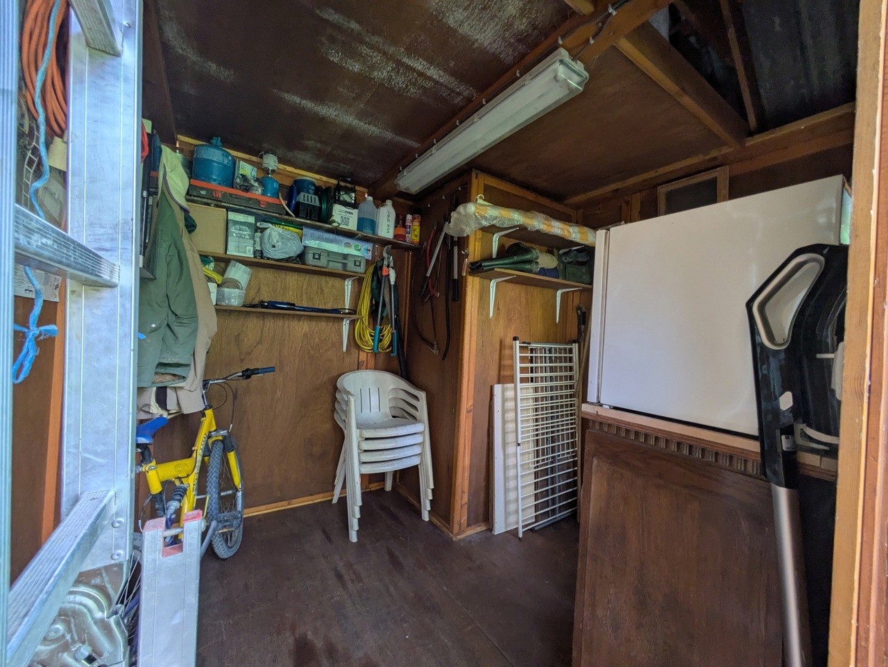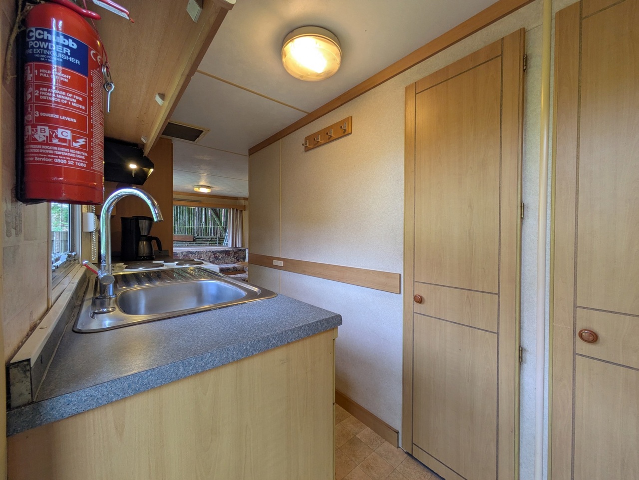 In de loods staat een goed beschutte stacaravan opgesteld, die momenteel wordt gebruikt als vakantiewoning. De caravan biedt plaats aan 5 personen en is voorzien van stadswater en een aansluiting op het elektriciteitsnet, met een conform gekeurde elektrische installatie. Verwarming, koken en warm water gebeuren volledig elektrisch.