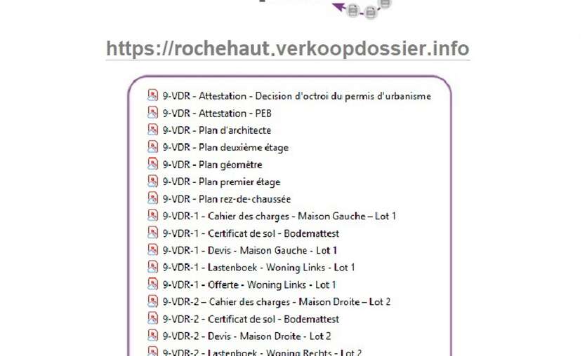 Het volledige verkoopdossier (lastenboek, plannen, bouwvergunning, PEB en offerte) is beschikbaar via https://rochehaut.immogoed.be